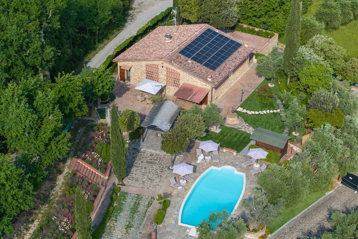 Περάστε τις διακοπές σας στην καρδιά της τοσκανικής υπαίθρου σε αυτό το άνετο πέτρινο σπίτι με δάπεδα από τερακότα και οροφές με δοκάρια από μασίφ βελανιδιά, επιπλωμένο με πίνακες του δημιουργού, εξοπλισμένο με όλες τις ανέσεις. Απολαύστε το κολύμπι στη μεγάλη πισίνα υπερχείλισης (18μ X 9μ, ανοιχτή από 1η Μαΐου έως 15 Οκτωβρίου μόνο για τους επισκέπτες του πέτρινου σπιτιού) ή χαλαρώστε σε μια πολυθρόνα κάτω από τη στοά, δοκιμάζοντας ένα ποτήρι κρασί Chianti μπροστά στους κυματιστούς λόφους με αμπελώνες, ελαιώνες, δάση και μεσαιωνικά χωριά.