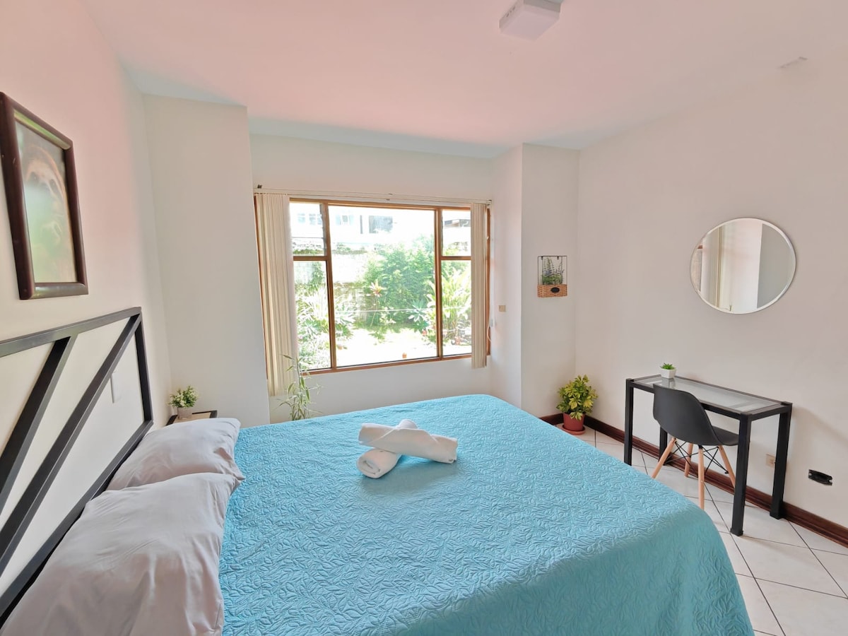 Cómodo apartamento para 5 personas con dos habitaciones y un área social con sofá cama en un lugar seguro, céntrico y con fácil acceso a los servicios públicos. Totalmente equipado con cocina completa, lavadora y secadora de ropa; con baño completo, agua caliente, wifi gratis. Ubicación en zona segura cerca de atracciones turísticas, hospitales, farmacia, supermercados y bancos.
