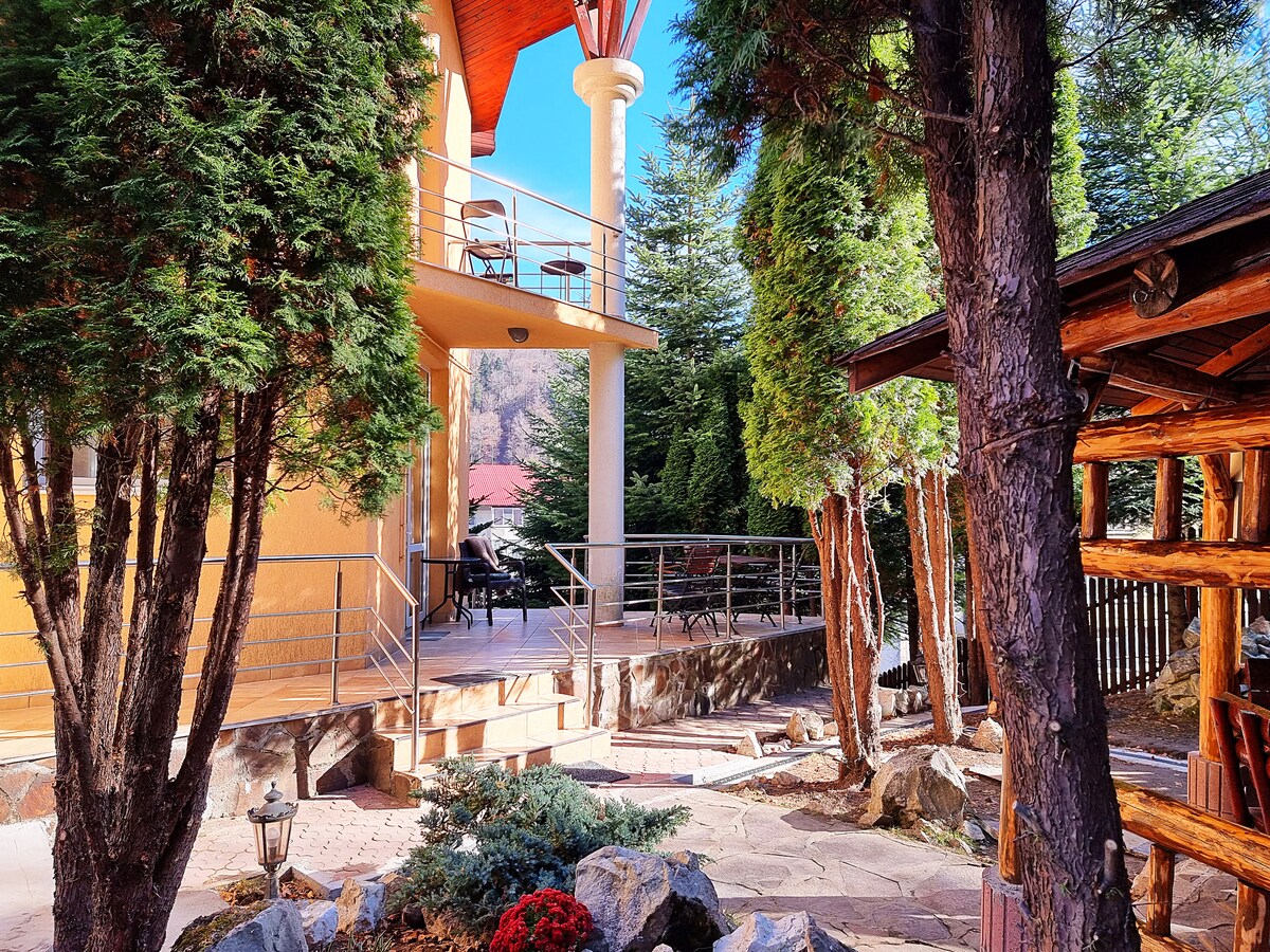 Καλωσορίσατε στην άνετη βίλα μας για ενοικίαση στο βουνό, που βρίσκεται μόλις 200 μέτρα από το διάσημο Κάστρο Cantacuzino στο Busteni. Ετοιμαστείτε να μαγευτείτε από την εκπληκτική θέα στα μεγαλοπρεπή βουνά Bucegi και τον Σταυρό του Caraiman. Με μέγιστη χωρητικότητα 10 επισκεπτών, η βίλα μας προσφέρει ένα ευρύχωρο και άνετο καταφύγιο για οικογένειες, φίλους ή οποιαδήποτε ομάδα που αναζητά μια αξέχαστη απόδραση στο βουνό. Οι τιμές περιλαμβάνουν πρόσβαση στη ζώνη σπα με εσωτερικό τζακούζι, που θερμαίνεται μόνιμα.