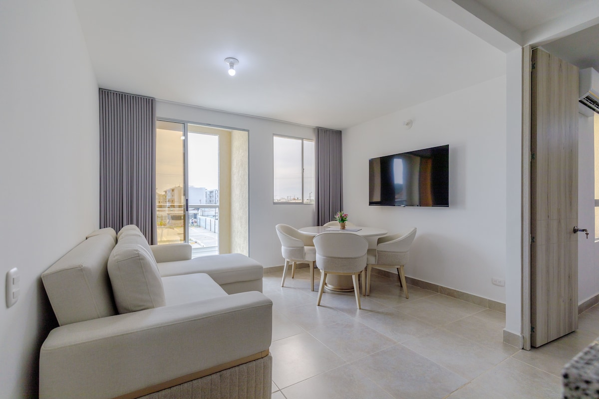 ★ Beautiful Beachfront Apartment ★ located in the Morros Ío condominium, Serena del Mar — one of the most exclusive and modern areas of Cartagena. "Stunning side view of the Caribbean Sea" "Exclusive beachfront resort with magnificent spaces to relax and enjoy" "Professional cleaning and disinfection" → 10 minutes from Rafael Núñez International Airport → 15 minutes from the Historic Walled City → 3 minutes from Las Ramblas Mall → Surrounded by renowned hotels: Meliá, Estelar, and Karibana