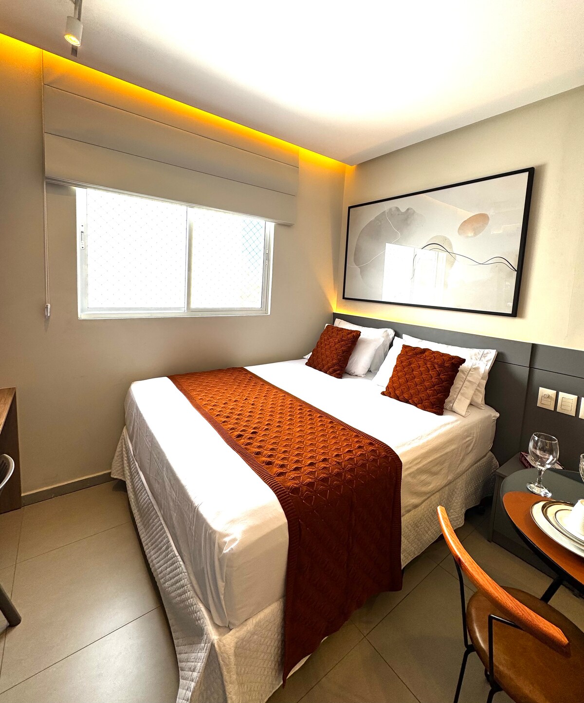 Seja bem-vindo ao seu novo lar temporário! Studio moderno e totalmente equipado, com localização privilegiada, no bairro mais nobre da cidade – com tudo o que você precisa a poucos passos de distância: bares, restaurantes, supermercados e o principal shopping da região. 🛏 Acomodação inteligente e estilosa, pensada para oferecer conforto e praticidade em cada detalhe. A decoração minimalista cria um ambiente aconchegante e elegante, ideal para quem busca uma estadia tranquila e funcional.