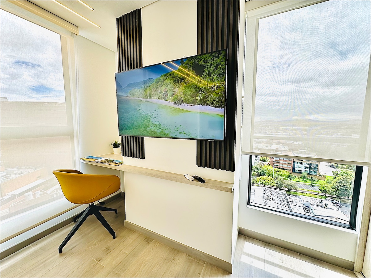 With an amazing view over Bogota, this cozy and comfortable apartament is the best place to enjoy the city. Hi speed internert. Close to restaurants, cafes, supermarkets . Very centric location to move arround Bogotá, with easy public transport in the front of the building entrance. Amazing rooftop with 360 view and bbq zone, gym, meeting rooms, bike parking and private parking. security 24hours
