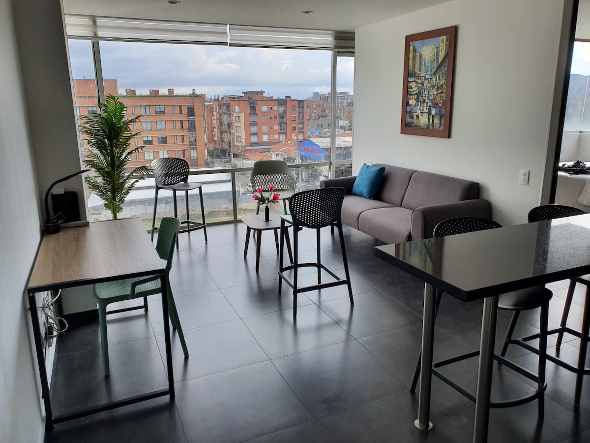 Lindo apartamento súper equipado y central en Bogotá, para 1 o 2 personas, con vías de entrada y salida rápidas para llegar a cualquier zona de la ciudad, restaurantes y sitios turísticos. ♥Dormir de lujo: Cama y colchón King Size de alta calidad. ♥Conexión Internet: Fibra Óptica 300Mb + WiFi ultra-rápido. ♥Seguridad: Edificio con recepción vigilancia 24h, ascensor. ♥Sube a una terraza 360° con vista única de la ciudad ♥Ventana anti-ruido.