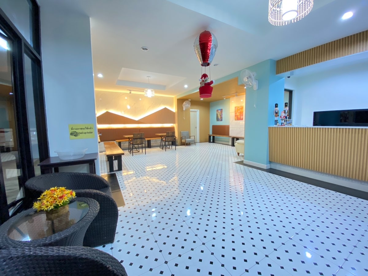 โรงแรม 7 ชั้น ใจกลางเมืองปากช่อง สะอาด free WiFi ใกล้ตลาดไนท์บารซ่าร์ซึ่งเป็นเอกลักษณ์ของปากช่อง ใกล้ทางคมนาคม เช่นสถานีรถไฟ รถตู้ และรถบัส เดินทางสะดวก หารถแท้กซี่ไปเที่ยวอุทยานแห่งชาติได้ง่าย