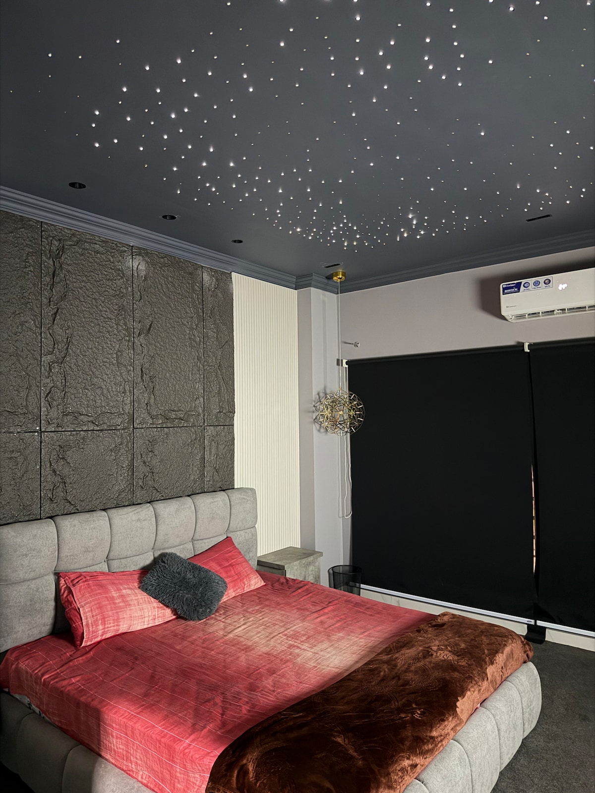 Step into a magical experience at our Starlight Apartment, where comfort meets aesthetic luxury. This one-of-a-kind space features a stunning star-lit ceiling, creating a peaceful and romantic vibe that feels like sleeping under the night sky. Perfect for couples, travelers, and anyone looking to unwind in style, this apartment is designed with a modern touch and premium finishes.