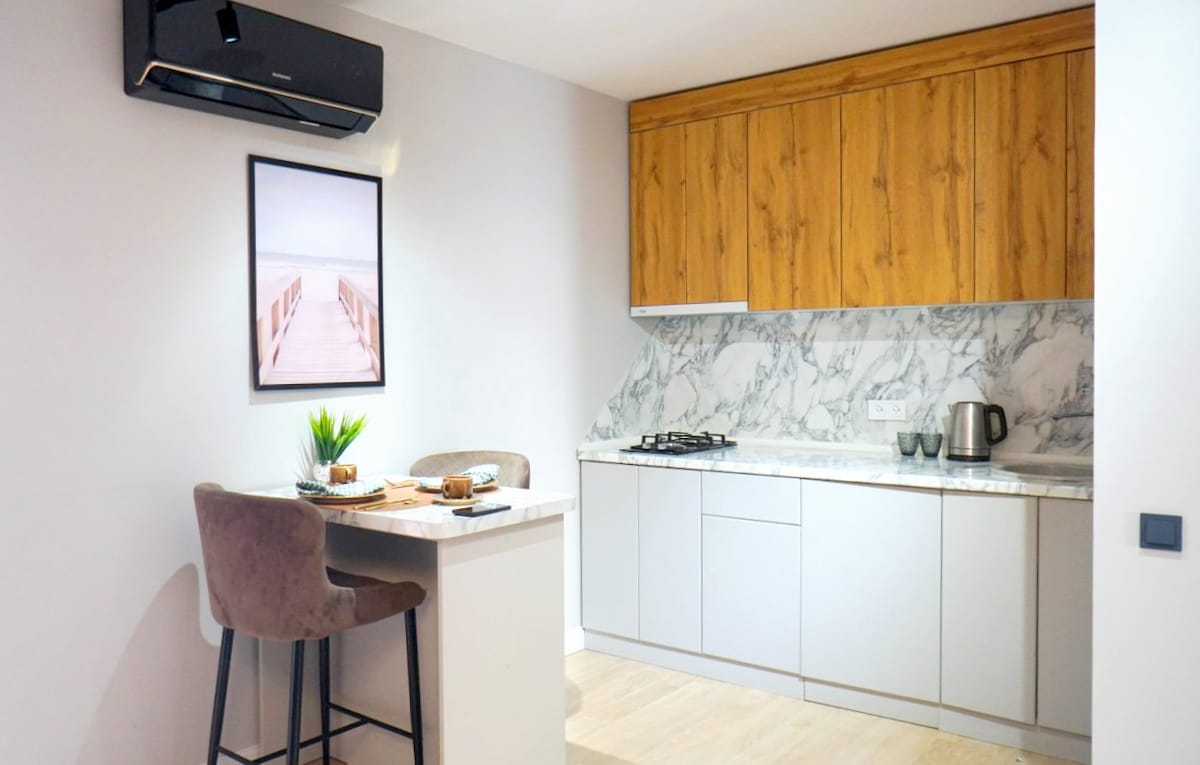 Απολαύστε κομψές διακοπές στην καρδιά της πόλης. Καθημερινά καθαρό, άνετο διαμέρισμα ενός υπνοδωματίου στο κέντρο της πόλης. Wifi, ψηφιακή τηλεόραση, πλυντήριο ρούχων, ψυγείο, φούρνος μικροκυμάτων, τηλεόραση Samsung LED (έξυπνη), σύστημα διαχωρισμού, πιστολάκι για τα μαλλιά, καθαρά κλινοσκεπάσματα και πετσέτες, σαμπουάν, πόσιμο νερό παντού.