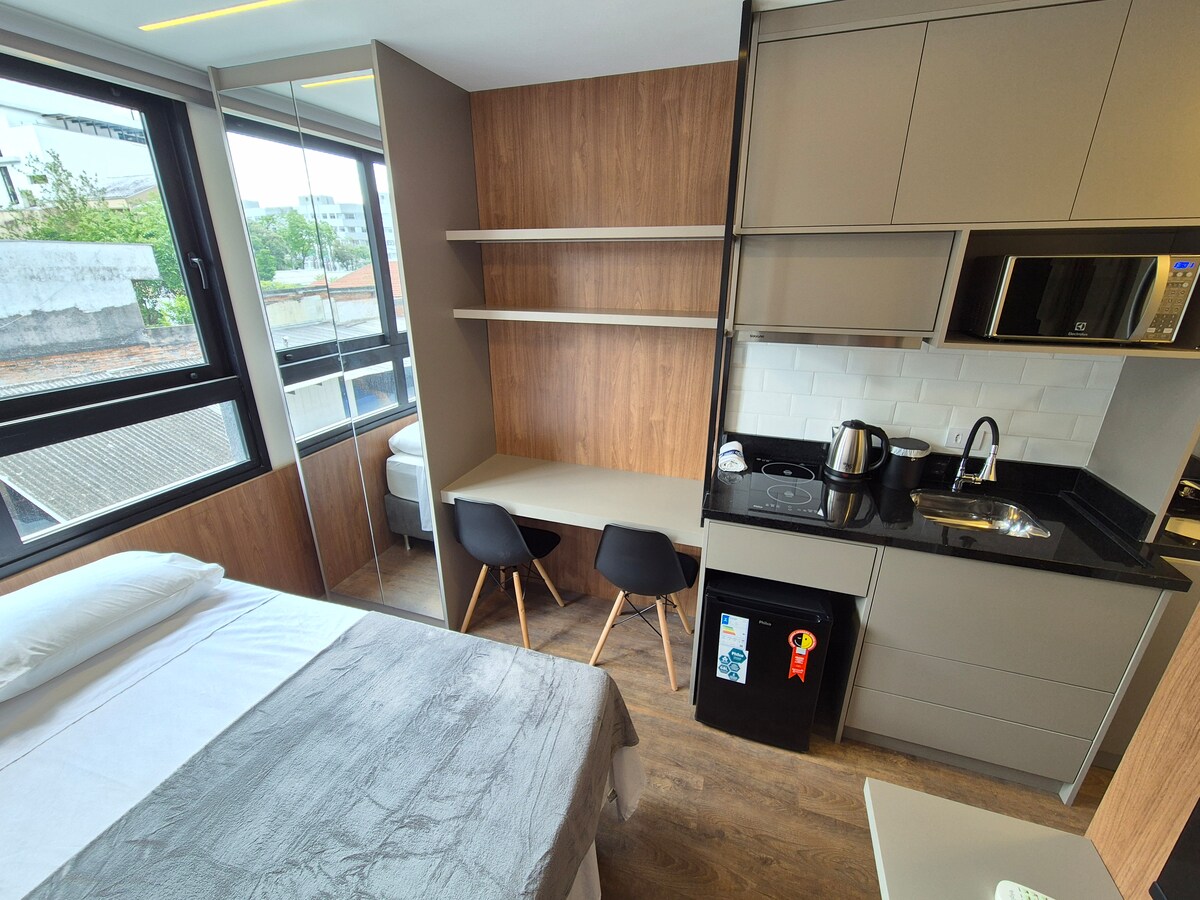 Ένα στούντιο που μπορείτε να αποκαλέσετε δικό σας, πλήρως εξοπλισμένο και διακοσμημένο για να φιλοξενήσει ομάδες έως 4 άτομα. Μπορείτε να περιμένετε έναν καθαρό, αεριζόμενο χώρο, άνετα κρεβάτια, ποιοτικά κλινοσκεπάσματα και μπάνιο - όλα έτοιμα για μια διαμονή μικρού-μεσαίου χρόνου. Η τοποθεσία είναι ασυναγώνιστη, αν και βρίσκεται λιγότερο από 10 λεπτά με το αυτοκίνητο από το κέντρο της Κουριτίμπα, το κατάλυμα βρίσκεται σε μια ήσυχη γειτονιά, πίσω από το Bosque do Papa (40 μέτρα) και κοντά στο Μουσείο Oscar Niemeyer (5 λεπτά με τα πόδια).