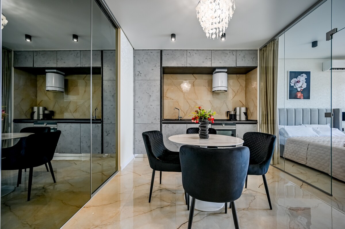 Το White Elegance είναι ένα εξαιρετικό διαμέρισμα δύο δωματίων για τους γνώστες της αισθητικής με σχεδιασμό από σχεδιαστή και πλευρική θέα στη θάλασσα. Πανοραμικά τζάμια στο σαλόνι, ένας καθρέφτης στην κουζίνα, φυσικό παρκέ, κομψά, νέα έπιπλα δημιουργούν μια ατμόσφαιρα άνεσης και πολυτέλειας. Το διαμέρισμα έχει • Πλήρες υπνοδωμάτιο με υπέρδιπλο κρεβάτι, μεγάλη ντουλάπα και τηλεόραση • Ιδιωτικό σαλόνι με σαλόνι: βελούδινος καναπές, πολυθρόνες • Ευρύχωρη κουζίνα με τραπεζαρία και όλες τις απαραίτητες συσκευές