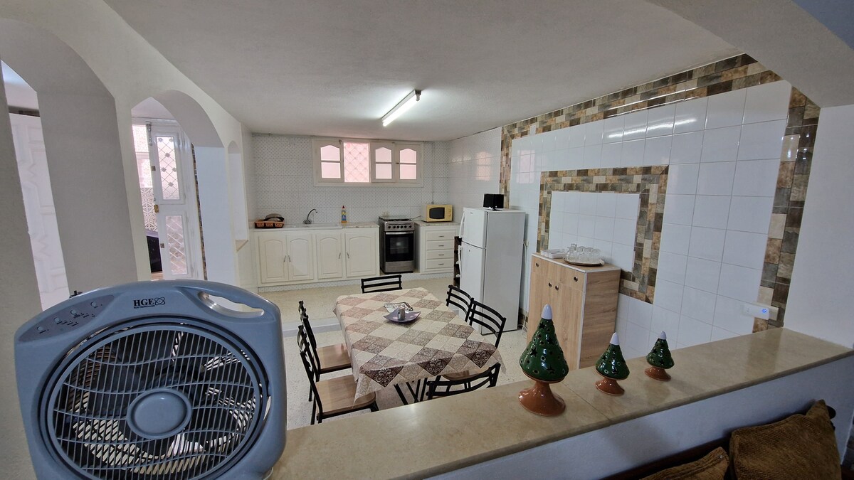 Μεγάλο σπίτι, εξοπλισμένο με όλα όσα μπορούν να χρησιμοποιηθούν, αλάτι, σαπούνι, απορρυπαντικά... ψυγείο. 2 τραπέζια (εσωτερικά και εξωτερικά), μπάρμπεκιου, καναπέ, έπιπλα και τηλεόραση. μεγάλη βεράντα με θέα στη θάλασσα 2ο εξωτερικό ντους και νιπτήρας. Το σπίτι βρίσκεται σε στρατηγική θέση στην Tazarka (4 λεπτά από τη θάλασσα με αυτοκίνητο, 10 λεπτά με τα πόδια),πολύ χρήσιμο για να μετακινηθείτε στις πιο όμορφες περιοχές του Nabeul. Το σπίτι είναι εξοπλισμένο με ΤΑ ΠΆΝΤΑ (βρίσκεται στον 3ο όροφο) Η πρόσβαση επιτρέπεται παντού.