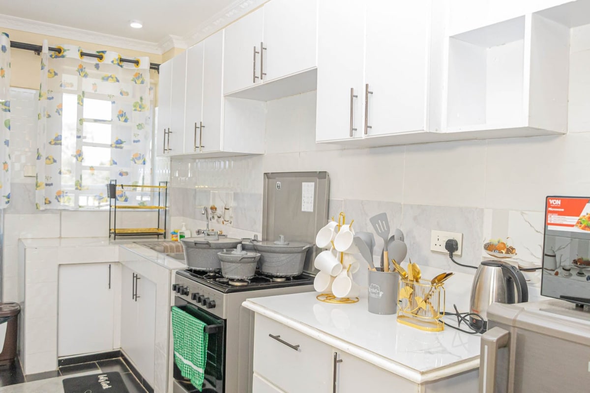 Ζήστε το τέλειο μείγμα αστικής κομψότητας και άνεσης σε αυτό το εξαιρετικό διαμέρισμα που βρίσκεται μόλις 5 χιλιόμετρα μακριά από το Nakuru City CBD και 7 χιλιόμετρα από το Εθνικό Πάρκο Nakuru. Το διαμέρισμα είναι εξοπλισμένο με internet υψηλής ταχύτητας, έξυπνη τηλεόραση και ένα μεγάλο πολύ ελαστικό κρεβάτι από αφρώδες υλικό για να εξασφαλίσει έναν άνετο ύπνο. Μπορείτε επίσης να απολαύσετε μια πλήρως εξοπλισμένη κουζίνα με φούρνο μικροκυμάτων, ψυγείο και κουζίνα αερίου, καθώς και ένα πλυντήριο ρούχων που μπορεί να χειριστεί φορτία 7 κιλών.