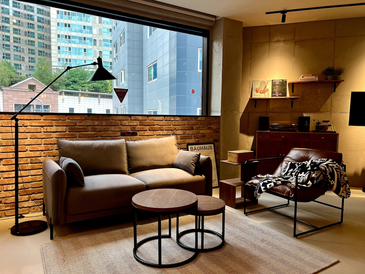 Ζήστε την πολυτέλεια του Μπρούκλιν στην καρδιά της Σεούλ στο Boutique Hotel FRGE. Η κομψή σουίτα μας φιλοξενεί 4 επισκέπτες με 2 κρεβάτια queen size, πλήρως εξοπλισμένη κουζίνα, ιδιωτικό ντους και ειδικό χώρο εργασίας. Περιτριγυρισμένο από μοντέρνα καφέ, μπαρ και την κεντρική αγορά της Σεούλ, είναι ιδανικό για τους λάτρεις του φαγητού και τους εξερευνητές. Απολαύστε κομψή επίπλωση, πικάπ βινυλίου, έξυπνη τηλεόραση και την άνετη ατμόσφαιρα του δικού σας κρυμμένου διαμαντιού στη Σεούλ. Απέχει μόλις 10 λεπτά με τα πόδια από το Sindang (Γραμμή 2) και το Dongmyo (Γραμμή 6).