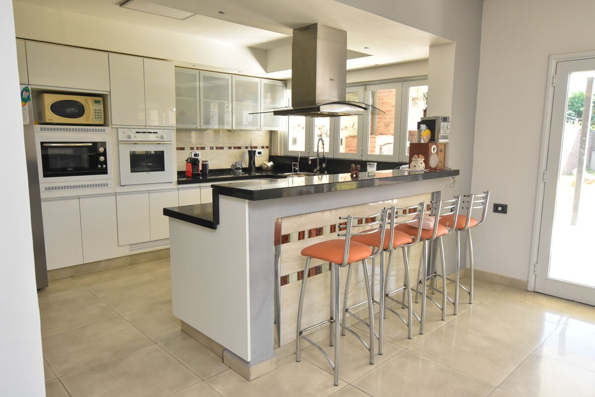 Casa amplia con buena iluminación, dormitorio en suite con cama King size, balcón, vestidor, ducha escocesa; 1 dormitorio con 2 camas de de 90x190 y placard; lavarropas automático: cocina-comedor con campana central, anafe, hornos eléctrico., horno a gas, microondas, heladera side by side, TV 48" curvo con barra de sonido; 1 oficina con escritorio, 4 Baños agua F y C con inodoro, bidet y duchas; patio interno; 1 galería con parrilla, anafe a gas, horno a leña, mesa y y sillas, 1 piscina.