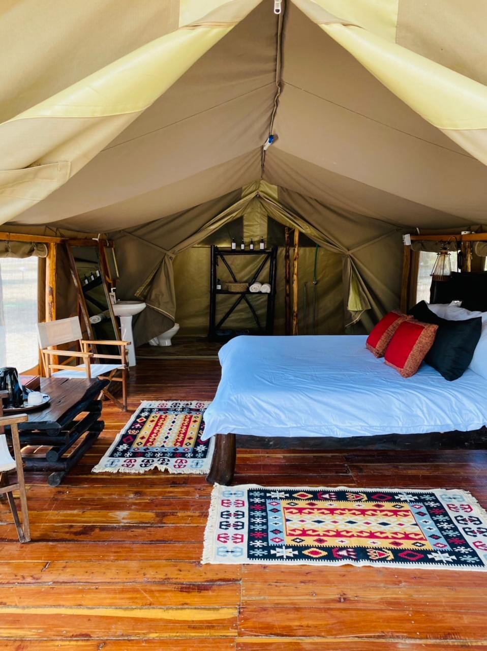 Πολυτελές κατάλυμα σε σκηνή με όλα τα οικιακά ανέσεις. 4 ευρύχωρες σκηνές με ιδιωτικό μπάνιο και μια σκηνή με τραπεζαρία, καθιστικό και κουζίνα. Κομψά σχεδιασμένο με άνετα ανακυκλωμένα έπιπλα από παλέτες και τροφοδοτούμενο από ηλιακή ενέργεια: αυτό το βιώσιμο κατάλυμα με δυνατότητα εστίασης σάς απομακρύνει από το ηλεκτρικό δίκτυο. Το Glamp βρίσκεται σε ένα μαγικό αγροοικολογικό αγρόκτημα, μέσα σε ένα δάσος από ακακίες, με θέα το καταφύγιο άγριας ζωής Ecoscapes, έναν κήπο της Εδέμ στην όχθη της λίμνης.