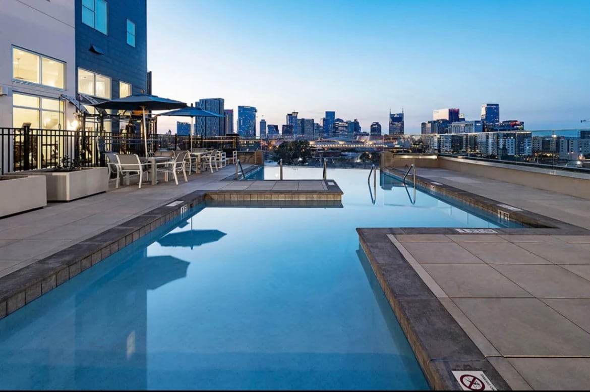 This unique space has a style all its own. Located in the heart of downtown Nashville and a short walk from Broadway’s Honky Tonks, the location can’t be beat! • 3rd floor rooftop pool with luxury amenities and lounge • Secure onsite parking available, first vehicle free! • Modern gym, yoga, and cycling studio • Fully equipped and stocked kitchen • High-speed Wi-Fi • Stunning views of the city skyline • 5 min walk to Music City Center • 5 min drive to The Gulch and Nissan Stadium