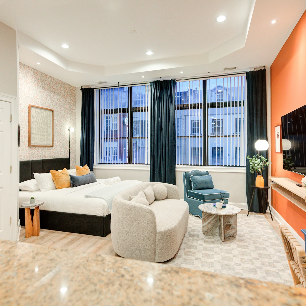 Studio, 1 Bathroom 1 Queen Bed Make yourself at home in the heart of Old City with a bright, open-concept space designed for easy city living. You’ll have a full kitchen for meals in, a cozy lounge setup for winding down, and in-unit laundry for longer stays—plus walkable access to Philly’s most iconic historic sights. Note: This is a lively city location—some street noise is possible. Not - stair free main entrance.