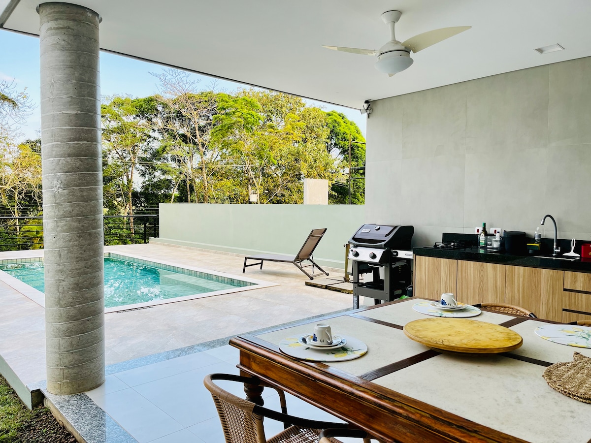 Πολύ άνετο σπίτι, 150 τ.μ. πισίνα, οπωροφόρα δέντρα, μεγάλο σαλόνι, χώρος μπάρμπεκιου, φούρνος άνθρακα, τρία ιδιωτικά μπάνια, τέσσερα υπνοδωμάτια, αιώρες, χώρος στάθμευσης για 4 αυτοκίνητα, γκουρμέ δωμάτιο με κλιματισμό. Όλα σε μια ωραία πολυκατοικία, μέσα στο δάσος του Ατλαντικού, με ιδιωτική είσοδο, σε ένα περιφραγμένο σπίτι. Εκτός από την ωραία αμμώδη παραλία, 2,5 χιλιόμετρα από το σπίτι, η περιοχή προσφέρει επίσης ωραίους καταρράκτες. Ιδανικό για φίλους και οικογένειες!!! Τρία en-suites και ένα υπνοδωμάτιο με κλιματισμό.