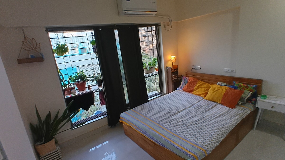 Mid-sized modern bedroom, 15 mins from Mumbai airport (Santa Cruz). Large window with fresh air and lots of light. Split AC, TV (regular channels + Netflix/Amazon Prime), free Wifi Part of a 3 bedroom apt occupied by a couple. Bathroom not attached, but just across the room door. Tea/coffee with biscui in the morning. Clean apartment with good vibes Convenient location in a quiet by lane off SV road. Breakfast, lunch, dinner at a nominal charge. Walking distance from SantaCruz station (W).