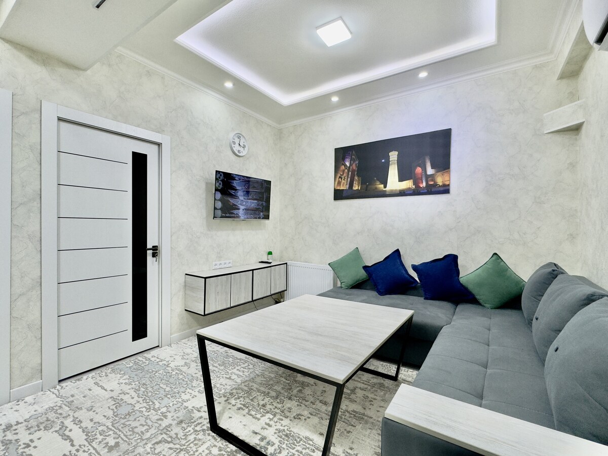 Κεντρικό, πλήρως επιπλωμένο και ολοκαίνουργιο διαμέρισμα σε κοντινή απόσταση (15 λεπτά/1,4 χλμ.) από την Παλιά Πόλη της Μπουχάρα. Απολαύστε ολόκληρο τον χώρο για να μαγειρέψετε, να πλύνετε ρούχα και να ξεκουραστείτε μεταξύ των ταξιδιών σας. Απολαύστε αυτό το ευρύχωρο και μοντέρνο διαμέρισμα. 1 υπνοδωμάτιο, 1 μπάνιο με πλυντήριο ρούχων. Ευρύχωρο σαλόνι με μετατρέψιμο καναπέ-κρεβάτι για 2 επιπλέον επισκέπτες, κουζίνα με ψυγείο, φούρνο και άλλες βασικές συσκευές.