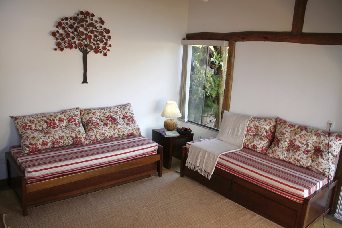 Chalé família Ingá (4 pessoas): R$ 997,00+ R$ 150,00 (se tiver hóspede adicional). O chalé Ingá oferece uma estadia serena e envolvida pela Natureza e uma vista linda do lago, das piscinas e do jardim. São 2 andares, um quarto com cama king size, banheiro e uma varanda com entrada independente. Embaixo, uma varanda grande, uma sala (reversível para quarto com 2 ou 3 camas, ou 2 sofás ou ainda uma cama de casal) televisão de 50" com Sky limitada, antena para canais abertos e cozinha equipada.
