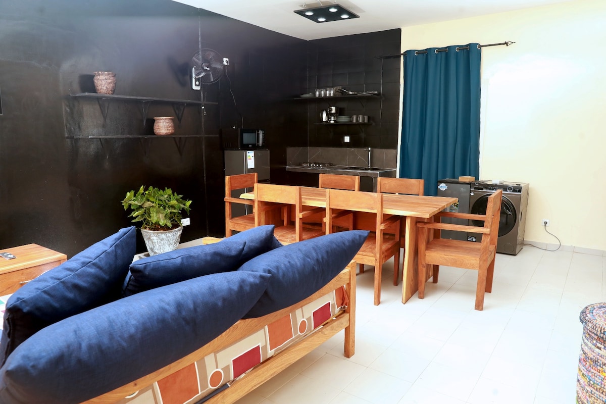 Studio neuf situé à 10 minutes de l’aéroport AIBD. Vous serez charmé par son côté spacieux et la simplicité de la décoration qui se démarque par sa touche ethnique made in Senegal. Le logement se trouve dans un quartier calme et sécurisé en plein développement proche de la gendarmerie et de quelques commerces. N’hésitez pas à me contacter pour tous renseignements complémentaires.