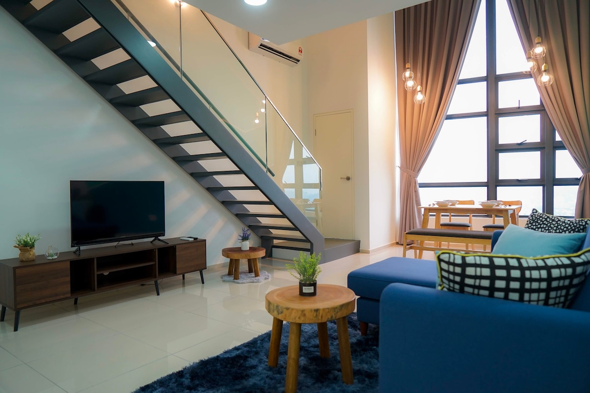 Ένα άνετο duplex στον υψηλότερο όροφο του κτιρίου (επίπεδο 21), με ένα μεγάλο διπλό κρεβάτι και έναν τριθέσιο καναπέ. Κατάλληλο για βραχυπρόθεσμες και μακροπρόθεσμες διαμονές. Το κτίριο βρίσκεται στο εμπορικό κέντρο De Centrum, με καταστήματα όπως το Super7 (σούπερ μάρκετ), το Tealive, το Mr. DIY, SPP Bookstore και 7-Eleven μεταξύ άλλων, και εγκαταστάσεις όπως πλυντήρια και μια κλινική (Poliklinik MyMedik). •Ώρα άφιξης: από τις 3 μ.μ. •Ώρα αναχώρησης: 12 μ.μ.