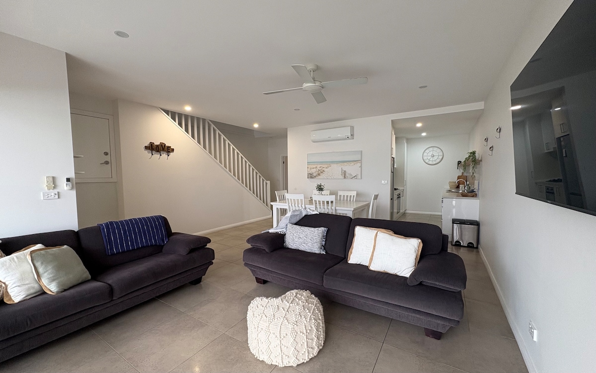 Enjoy the comfort of an entire two-storey townhouse — more space, more privacy and room to truly settle in. Two living areas, a private balcony and outdoor dining give you flexible places to relax together. Set within landscaped gardens and just a short walk to Caves Beach and local cafés, it’s an easy base for morning swims, coffee runs and laid-back coastal days.