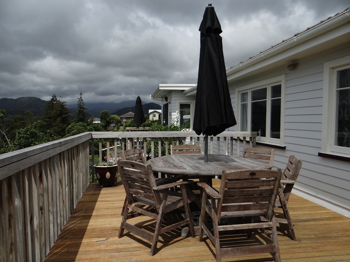 The best of both worlds! A quiet 1/2 acre sanctuary with extensive views out to sea but only a short distance to town. Completely separate lockable access to a generously sized, sunny studio apartment, with undercover parking next to your entrance. A mountain bike park on the back doorstep or a scenic walk into town. The walk back up is steep and requires moderate fitness. Otherwise sit back and drink in the view or wander in the garden.