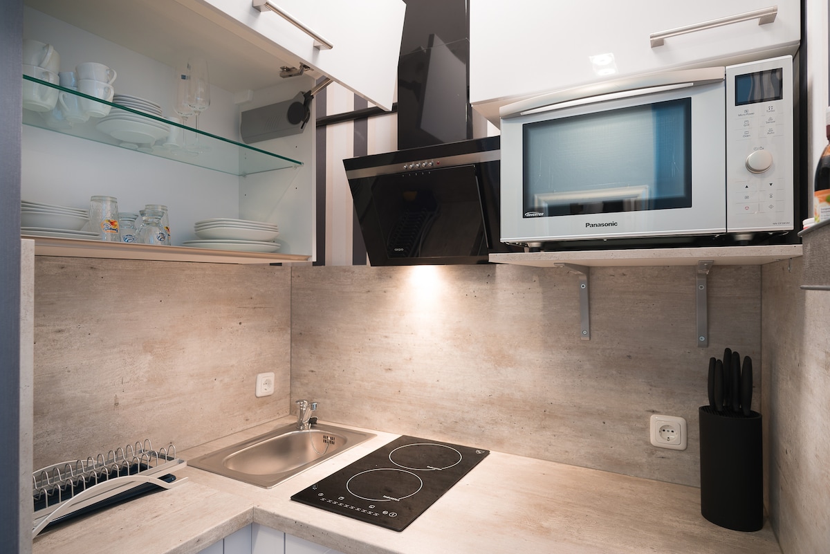 Διαμέρισμα 45 τ.μ. για 2 άτομα με μπάνιο με ντους/τουαλέτα, συμπεριλαμβανομένης κουζίνας, πλυντηρίου πιάτων, επαγωγικής κουζίνας 2 εστιών, ψυγείου και μπαρ με καθιστικό. Η κουζίνα είναι εξοπλισμένη για φαγητό και μαγείρεμα - μαχαιροπίρουνα, ποτήρια, πιάτα, κατσαρόλες κ.λπ. Διαθέσιμη ντουλάπα με χώρο για να στέκεστε. Άνετο μπαλκόνι με καθιστικό. Λάβετε υπόψη ότι αυτό το κατάλυμα διαθέτει ένα μεγάλο διπλό κρεβάτι κάτω από τη στέγη, με ύψος 160 εκατοστά και είναι προσβάσιμο μέσω ξύλινης σκάλας.