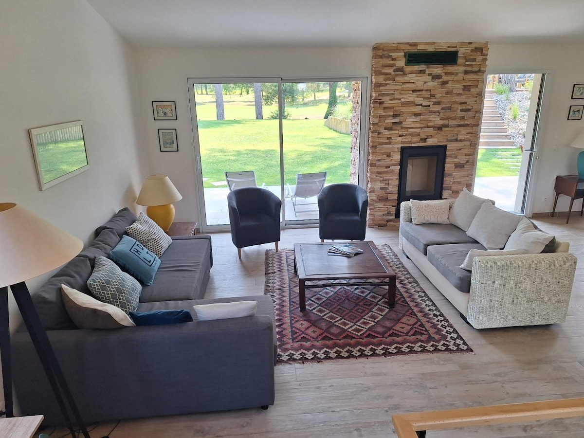 Γοητευτικό ξύλινο σπίτι με όλες τις ανέσεις, ήρεμο και ήσυχο. Ιδανικό για διαμονή με την οικογένεια ή με φίλους (μέγιστο 5 ενήλικες), διαθέτει έναν μεγάλο κήπο με θέα στο Golf des Pins. Ο κήπος διαθέτει γήπεδο για πέταγκ. Κατά την άφιξή σας το σπίτι θα είναι ζεστό και έτοιμο να σας υποδεχτεί, όλα τα δωμάτια θα είναι έτοιμα με σεντόνια και πετσέτες. Είμαστε στη διάθεσή σας για να ικανοποιήσουμε όλα τα αιτήματά σας, ώστε να έχετε μια εξαιρετική διαμονή.