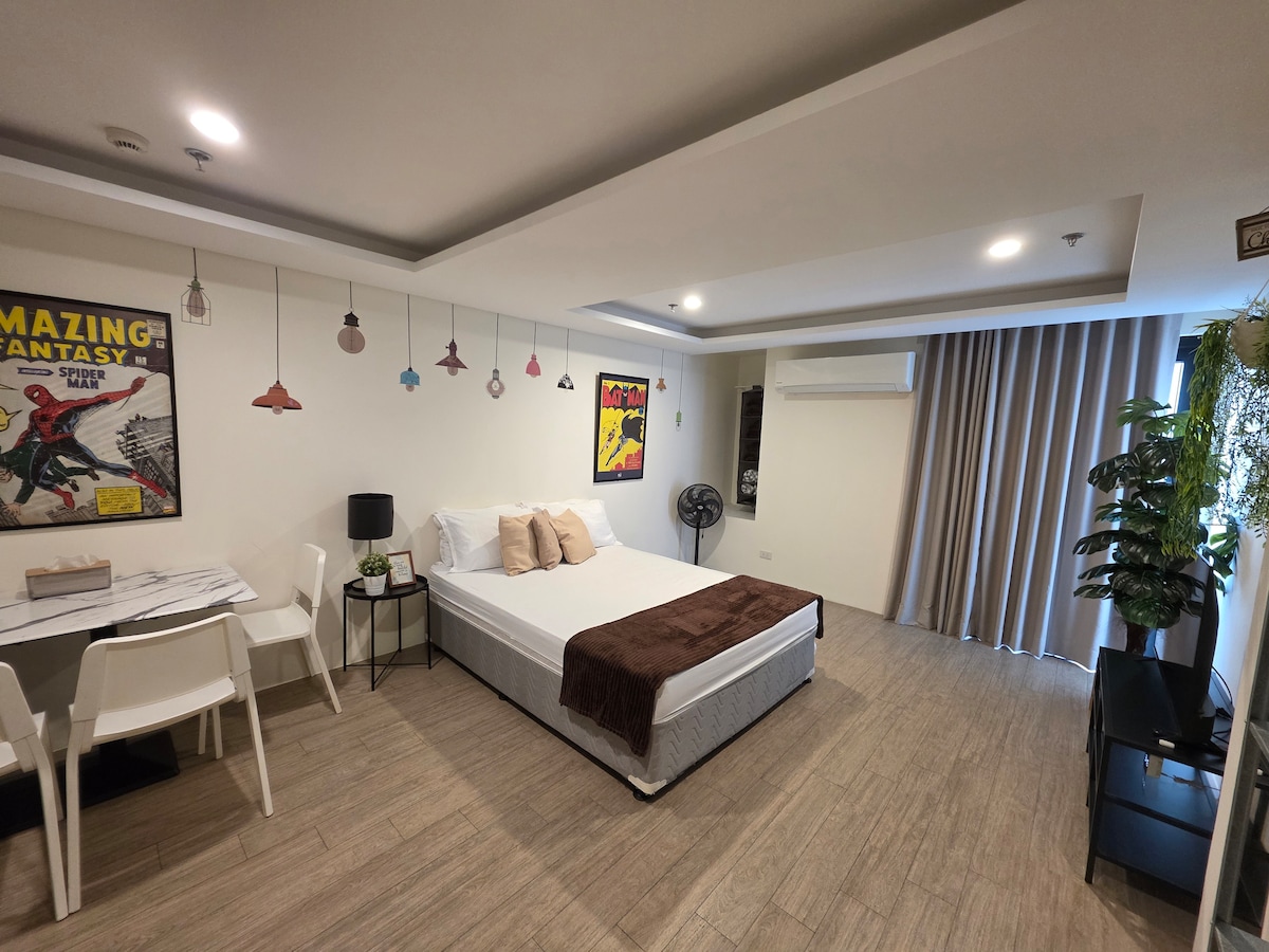 Take a break from the city—right within the city—on a budget. If you’re looking for a cozy place to spend quality time with your loved ones without leaving Metro Manila, this is the perfect staycation spot. Feel the cool breeze as you enter the gate, welcomed by pine trees that bring relaxing Tagaytay and Baguio vibes. The unit features a balcony, laundry area, kitchenware, a 50” Smart TV, a king-size bed, and all the amenities you need for a complete and comfortable staycation experience.
