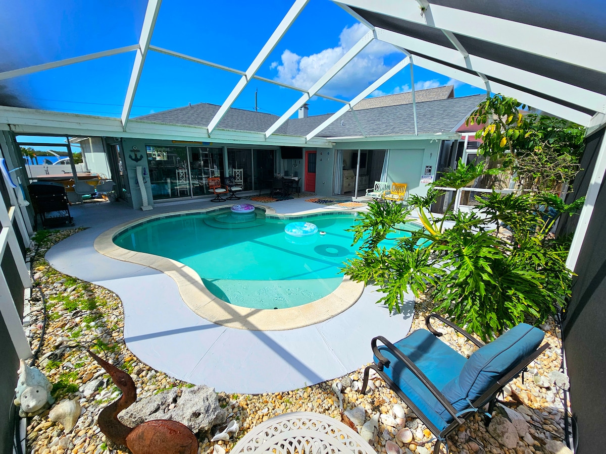 Θέα στο ηλιοβασίλεμα, ιδιωτική θερμαινόμενη πισίνα, καλύβα Τίκι και αποβάθρα!
