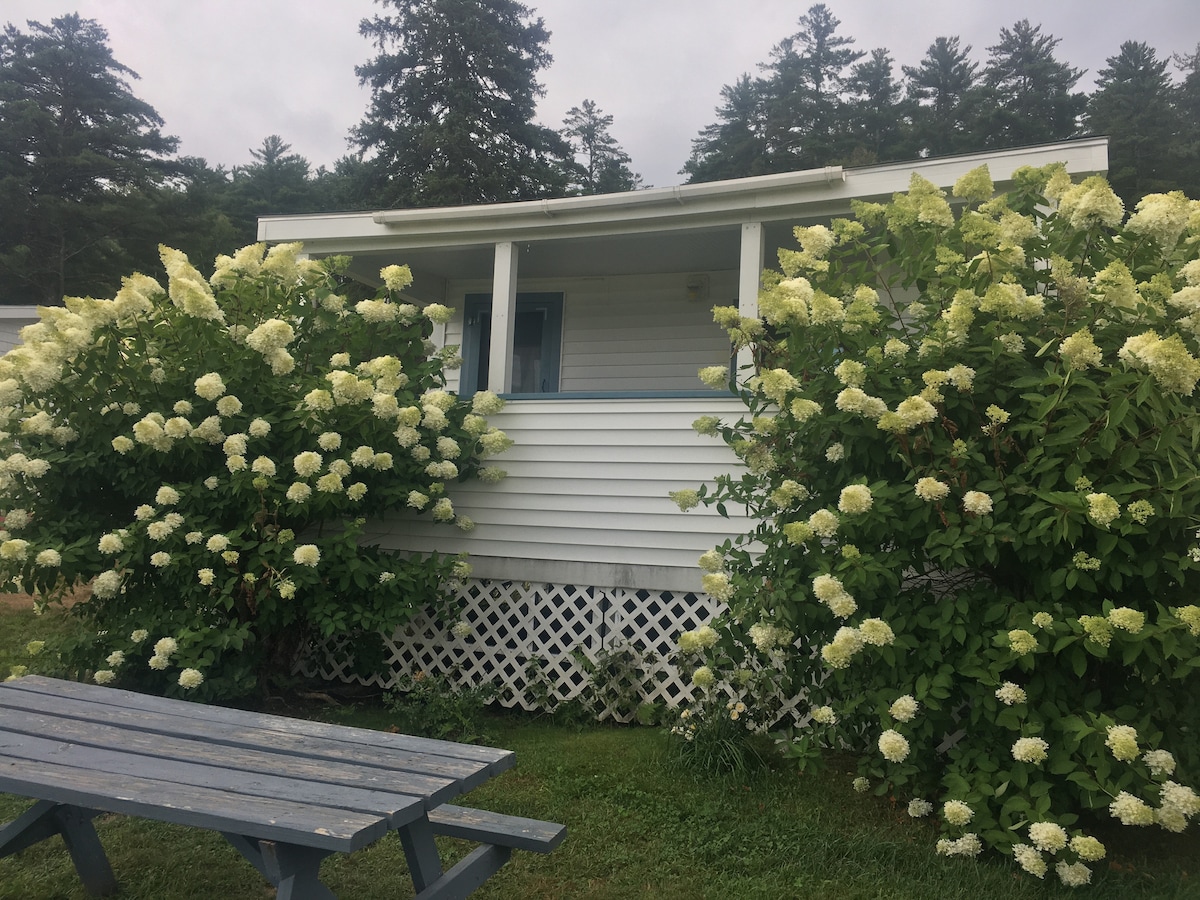Close to town and I 93, a rural paradise. You have your own driveway and private deck with gorgeous views of hills and gardens. The bed is surrounded by two walls of windows-with shades. There is a Hearthstone gas stove, a loveseat, and a huge custom shower in a modern bathroom. The kitchen has a full size refrigerator, a kitchen counter and sink, a microwave, a blender and crock pot. There is a television with cable, Netflix, etc. We stock coffee, and breakfast foods for your convenience.