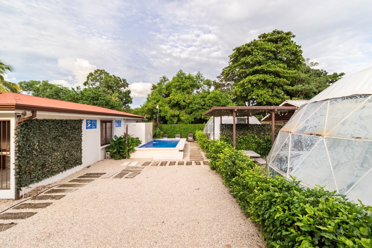 Καλώς ήρθατε στο ιδιωτικό σας γήινο θολωτό σπίτι, το οποίο διαθέτει υδρομασάζ για βραδιές κάτω από τα αστέρια, βεράντα ηλιοθεραπείας με ξαπλώστρες και κουζινάκι για τις ανέσεις του σπιτιού. Απέχετε μόλις λίγα λεπτά από τρεις παραλίες παγκόσμιας κλάσης, τοπικά εστιατόρια και ατελείωτες περιπέτειες στο Ποτρέρο της Κόστα Ρίκα. Στο Blue Ridge Resort, απολαύστε υπηρεσίες προσωπικής εξυπηρέτησης, κάντε κράτηση για ένα χαλαρωτικό μασάζ ή εξερευνήστε τις παροχές του θέρετρου (πισίνα, αίθουσα παιχνιδιών, καταφύγιο πτηνών, ψυχαγωγικές δραστηριότητες) λίγα μόνο βήματα από την πόρτα σας. Η απόδρασή σας στην Κόστα Ρίκα ξεκινά εδώ.