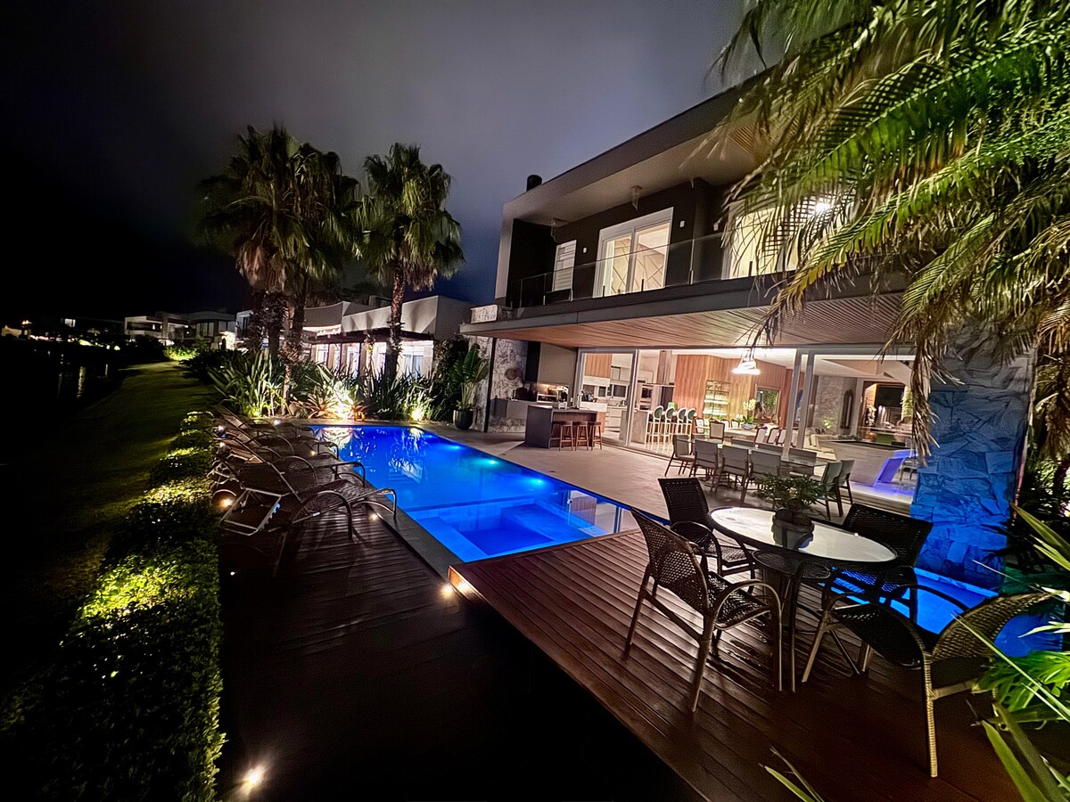 Πολυτελές σπίτι δίπλα στη λίμνη στο Riviera Condominium, Xangri-lá, με 4 σουίτες, 2 με μπαλκόνι και θέα στη λίμνη. Το σπίτι διαθέτει διπλό ύψος, τζάκι, αμερικανική κουζίνα με μπάρμπεκιου, ιδιωτική πισίνα και μοντέρνα πρόσοψη με εμφανές τσιμέντο. Το διαμέρισμα προσφέρει κοινωνική λέσχη, θερμική πισίνα, γκουρμέ χώρο, γήπεδα τένις και 24ωρη ασφάλεια. Ιδανικό για όσους αναζητούν άνεση και κομψότητα σε ένα αποκλειστικό περιβάλλον.