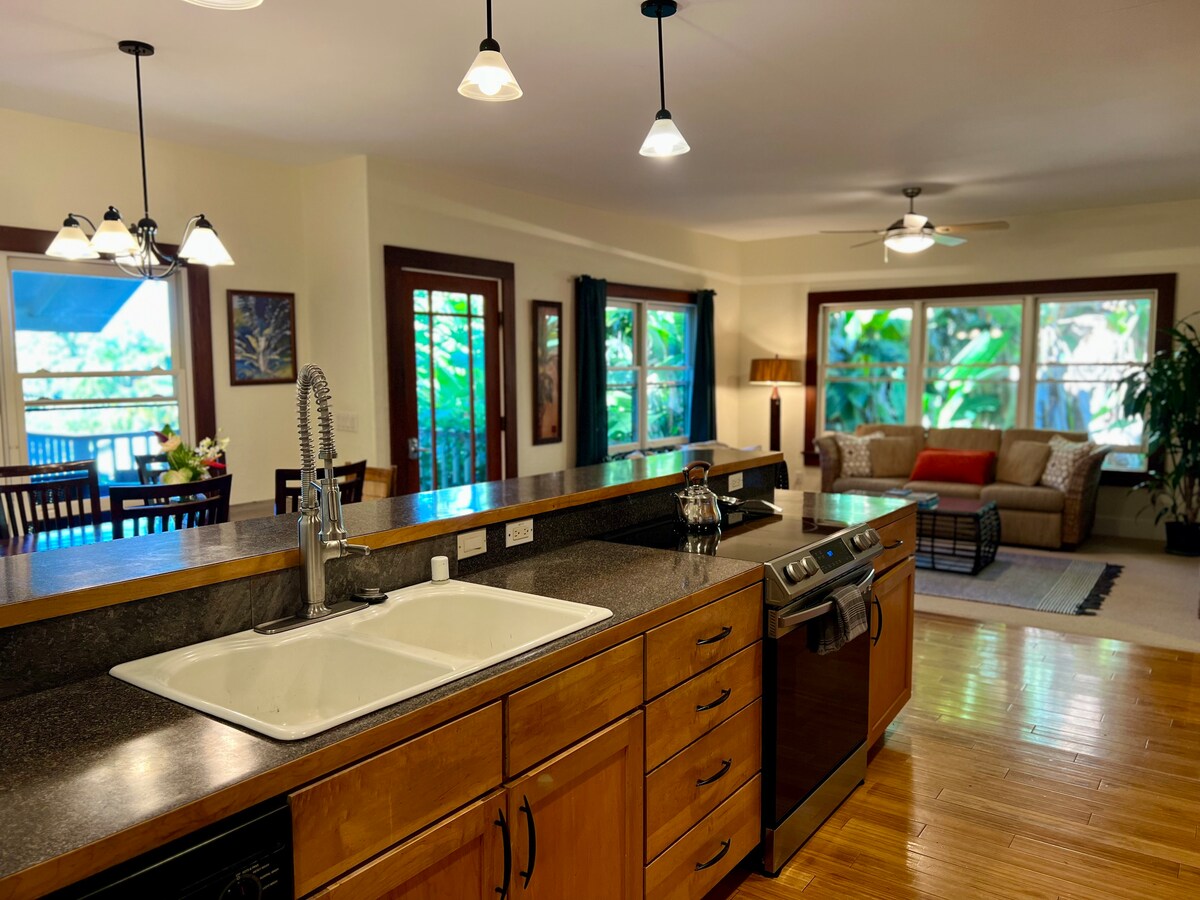 Αυτή η μοντέρνα αγροικία προσφέρει υπέροχη θέα στο πολυσύχναστο βιολογικό μας αγρόκτημα και την ακτογραμμή της Κόνα. Αυτό το ιδιωτικό κατάλυμα 2 υπνοδωματίων/2 μπάνιων, που βρίσκεται σε έναν απομονωμένο μπανανότοπο, διαθέτει άνετα κρεβάτια Cal King, καθαρά σεντόνια, ζωντανά φυτά, βίντατζ έπιπλα νησιού, καλά εξοπλισμένη κουζίνα και φιλόξενους εξωτερικούς χώρους διαβίωσης. Μπορείτε να δοκιμάσετε τα βιολογικά προϊόντα της φάρμας μας σε ένα καλάθι καλωσορίσματος, καθώς και σε κοντινά καταστήματα και εστιατόρια σε μικρή απόσταση με τα πόδια στο χωριό Kealakekua.