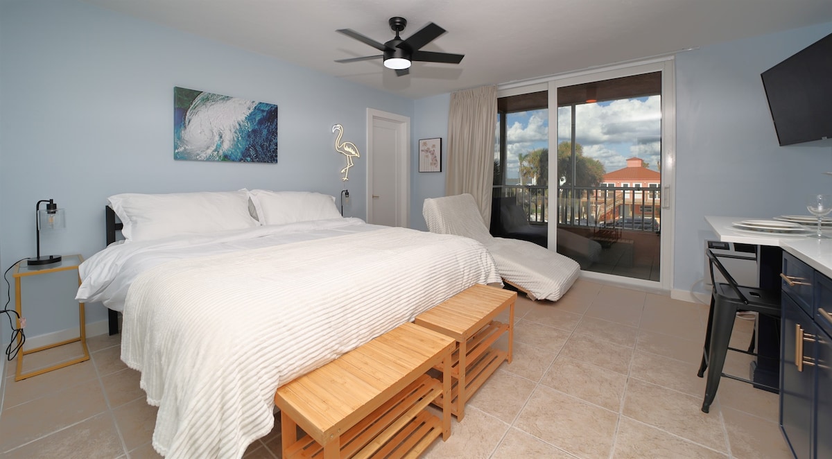 Beach within steps of this beautifully remodeled condo! DOC's restaurant & jet ski rentals, directly across the street. Beach gear available along with a cart to transport. Luxurious king size bed with extra plush mattress topper. Queen size sofa bed. Our studio will sleep up to 3 people (2 adults, 1 child) Newly refurbished pools opened April 2nd 2025.
