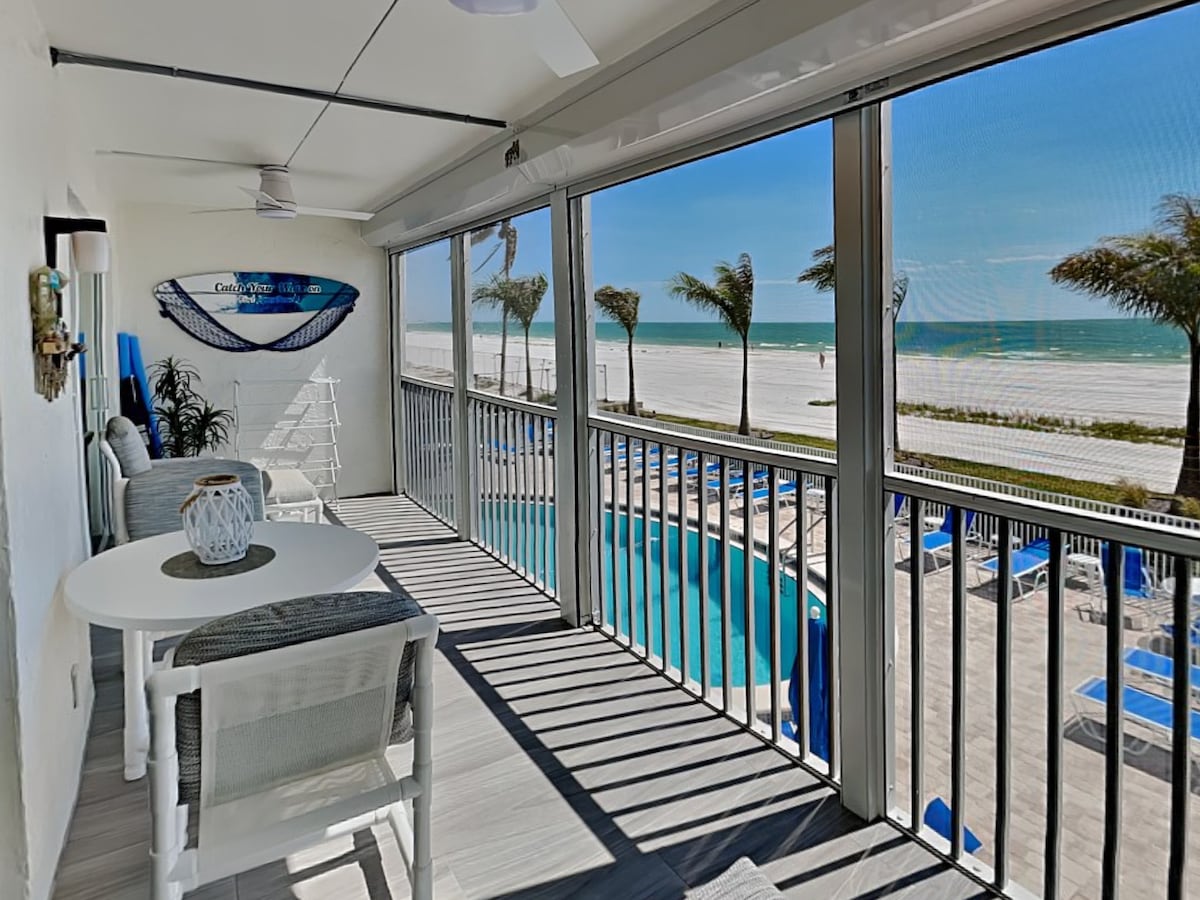 Welcome to Sea Salt at Castle Beach, a newly renovated 2-bedroom, 2-bath Gulf-front condo designed for relaxation, comfort, and effortless coastal living. The open living space includes a comfortable pullout sofa. Each bedroom features its own ensuite with a walk-in shower, offering privacy and convenience for couples, families, or friends traveling together. The lanai spans the width of the condo, delivering breathtaking, unobstructed views of the Gulf and your private stretch of beach.