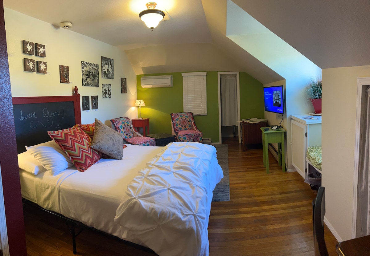 Ένα φωτεινό, χαρούμενο ισόγειο στούντιο με υπέρδιπλο κρεβάτι, νότια της αυλής. Τζάκι kiva που καίει ξύλα, μπάνιο με μπανιέρα/ντους και φυσικά προϊόντα περιποίησης. » Δωρεάν στάθμευση εκτός δρόμου. » Ένα δωρεάν πάσο μουσείου (20 $, ενώ οι προμήθειες διαρκούν). » DirecTV με premium κανάλια HBO. » Φωτεινό σπίτι για διαμονές επτά ή περισσότερων ημερών. » Παρέχονται καφές, τσάι και εμφιαλωμένο νερό.