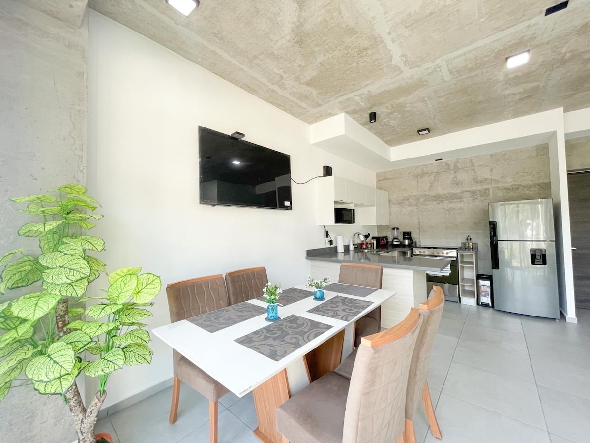 New, cozy and modern apartment in a central area of the capital, with turquoise details. It has a beautiful view of the city and a unique balcony. The apartment it is located on level 8. It is very well equipped with everything you need for a pleasant stay. With fast Wifi, Smart TV, hot water, air conditioning, kitchen with everything you need. Pool, gym, rooftop and more. Very well located, less than 5 minutes from the largest shopping centers, restaurants and bars. Safe and exclusive area