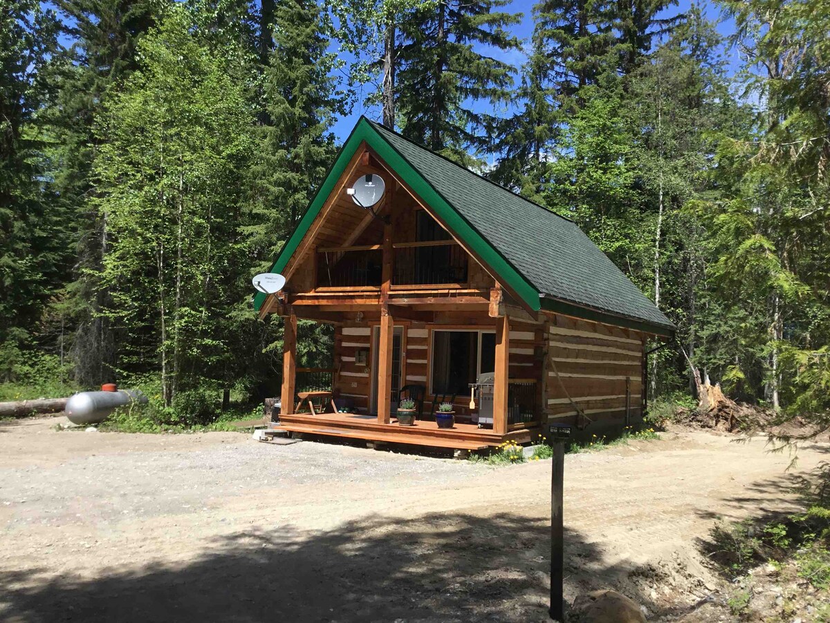 Enjoy this eco friendly, small but cozy two bedroom rustic cabin with the view of Willowbank Mountain. Cabin has the basic necessities you need during your stay. It is situated in a 20 acres homestead surrounded with mountains and lush forest. It's a perfect place to unwind and relax after your mountain adventures. We are located 18-20 minutes drive west from the town of Golden in the quiet and beautiful Blaeberry Valley. PLEASE READ LOCATION, WIFI CONNECTION, DETAILS BEFORE BOOKING.