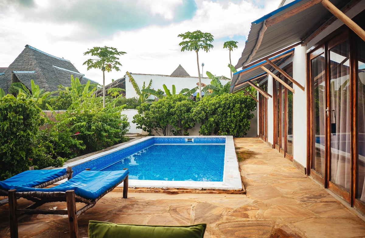 **ΝΕΟ! Ένα νόστιμο πρωινό περιλαμβάνεται στην τιμή για έως και 4 επισκέπτες.** Απολαύστε μια άνετη βίλα δύο υπνοδωματίων που βρίσκεται σε ένα τροπικό δάσος, 3 λεπτά με τα πόδια από τον ωκεανό. Θα διαπιστώσετε ότι η παραλία είναι ιδανική για ηλιοθεραπεία και snorkeling. Η βίλα βρίσκεται στο Φουτσανι, στη βόρεια Ζανζιβάρη. Οι καλύτερες παραλίες του Kendwa απέχουν μόλις 8 χιλιόμετρα. Οι επισκέπτες έχουν πρόσβαση 24 ώρες το 24ωρο σε μια μεγάλη πισίνα δίπλα στο ξενοδοχείο μας. Επιπλέον, υπάρχει ένα εστιατόριο που προσφέρει νόστιμα θαλασσινά.