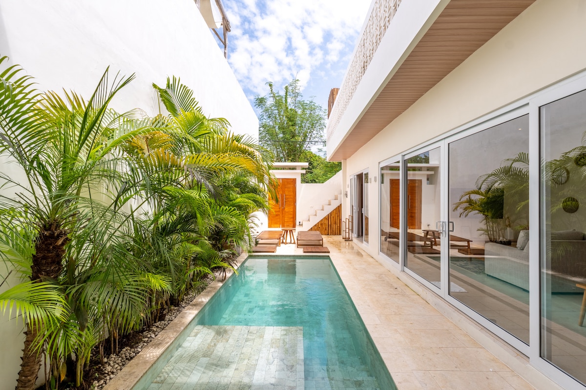 Ολοκαίνουργια βίλα 2 υπνοδωματίων και 2 μπάνιων στην καρδιά του Uluwatu. 5 λεπτά από την παραλία Uluwatu και Nyang Nyang, 10 λεπτά από την παραλία Bingin. 5-10 λεπτά από όλα τα πιο δημοφιλή εστιατόρια και μπαρ, καφετέριες, χώρους συνεργασίας και γυμναστήρια. Μια ήσυχη, ιδιωτική βίλα με τη δική σας πισίνα με χλωριωμένο θαλασσινό νερό και ευρύχωρη πίσω αυλή για να επιστρέψετε σε μια γειτονιά 7 βιλών με ασφάλεια 24 ώρες το 24ωρο, 7 ημέρες την εβδομάδα. Τα καταφύγια μας στη ζούγκλα προσφέρουν μια οικεία εμπειρία, σαν να είστε στο σπίτι σας!