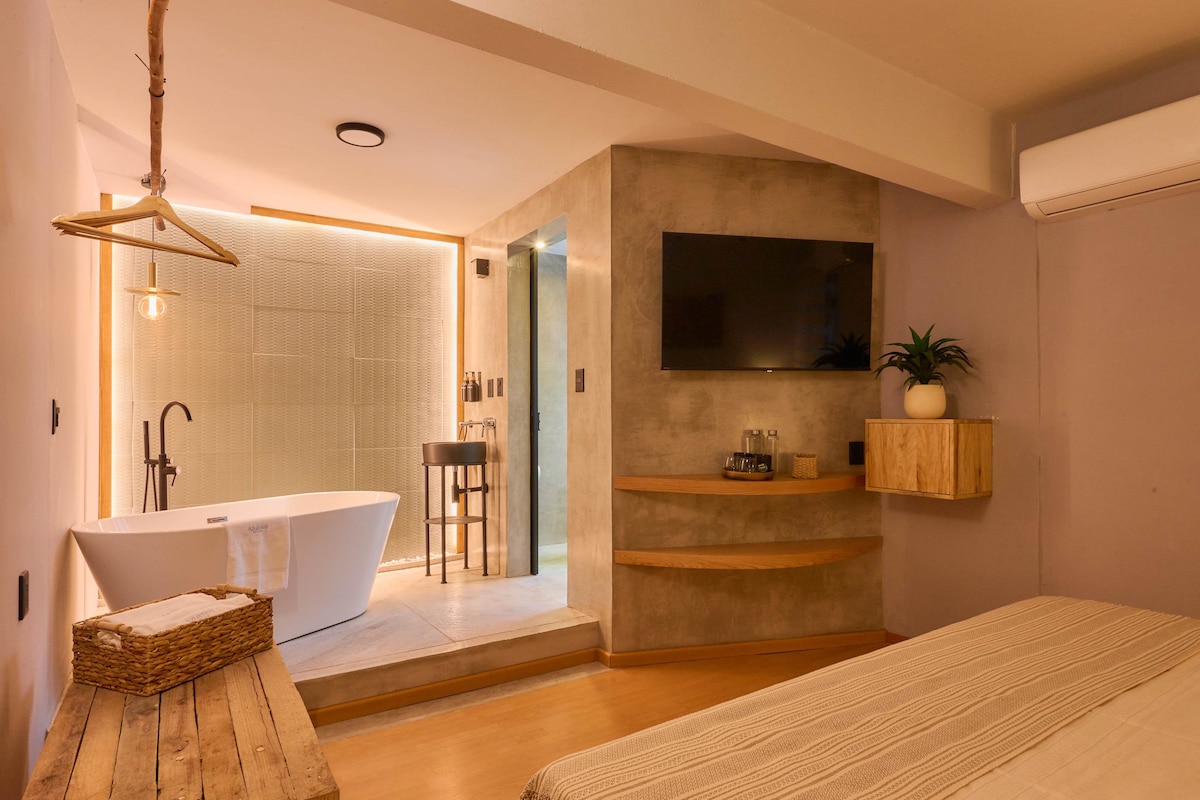 Το δίκλινο δωμάτιο βρίσκεται στο ισόγειο, προσφέροντας έναν άνετο, δροσερό και ήσυχο χώρο, ιδανικό για ξεκούραση ή τηλεργασία. Το μποέμικο-τροπικό ντιζάιν του δημιουργεί μια χαλαρωτική ατμόσφαιρα ιδανική για μια ευχάριστη διαμονή. Διαθέτει δύο κρεβάτια queen size, κλιματιστικό, ανεμιστήρα, τηλεόραση, WiFi, ιδιωτικό μπάνιο, μίνι μπαρ, καφετιέρα Nespresso και μπαρ κουζίνας. Ως επισκέπτης μπορείτε να απολαύσετε τους κοινόχρηστους χώρους, όπως την πισίνα, το δωμάτιο συνεργασίας, το σαλόνι, την εξοπλισμένη κουζίνα και το κύκλωμα παρακολούθησης.