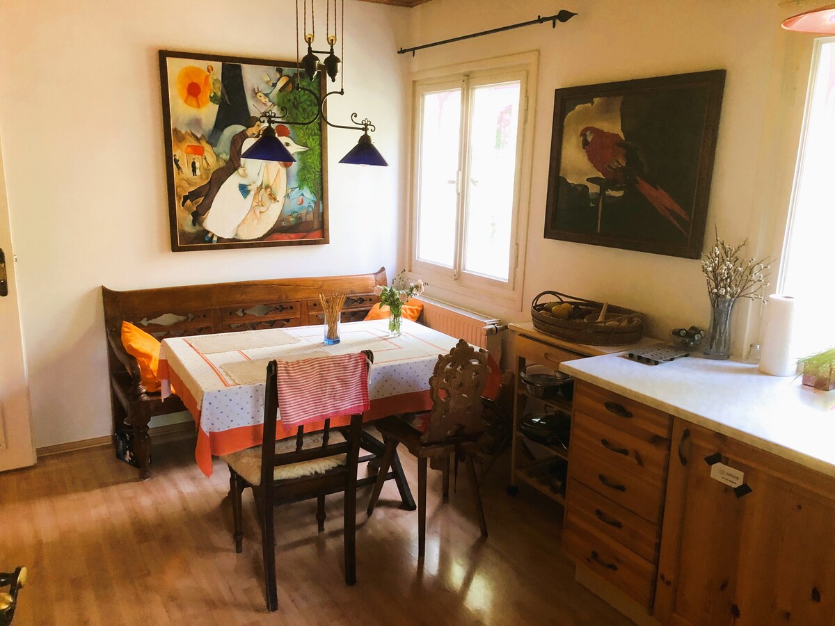 Sehr ruhige, gemütliche und stilvolle Ferienwohnung am Bach. Altbau mit Holz- und Steinböden. Neues Bad und neue Küche. Eine Mischung aus Alt und Neu mit viel Kunst und Kultur garniert. Im Sommer kann man auf der teilweise überdachten Terrasse oder im Garten im Liegestuhl entspannen. Der Garten ist zu mehr als der Hälfte naturnah gestaltet, mit Orchideen, anderen Wildblumen und Gräsern. In der kalten Jahreszeit werden Sie mit prasselndem Feuer im Kaminofen begrüsst und mit Kaminholz versorgt