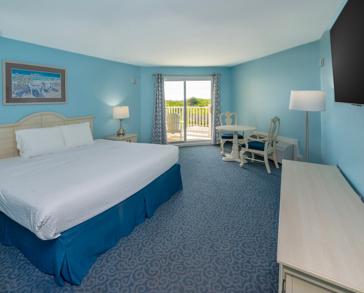 Unwind in an Oceanspray King with Balcony featuring a jetted tub, private balcony, and partial ocean views. Rooms include a microwave, coffee maker, and mini refrigerator. Enjoy 2 seasonal beach badges (6/15–9/7), beach chairs, towels, high-speed Wi-Fi, and daily fresh-brewed coffee and filtered water in the lobby. Rooms accessible via both elevator and stairs.