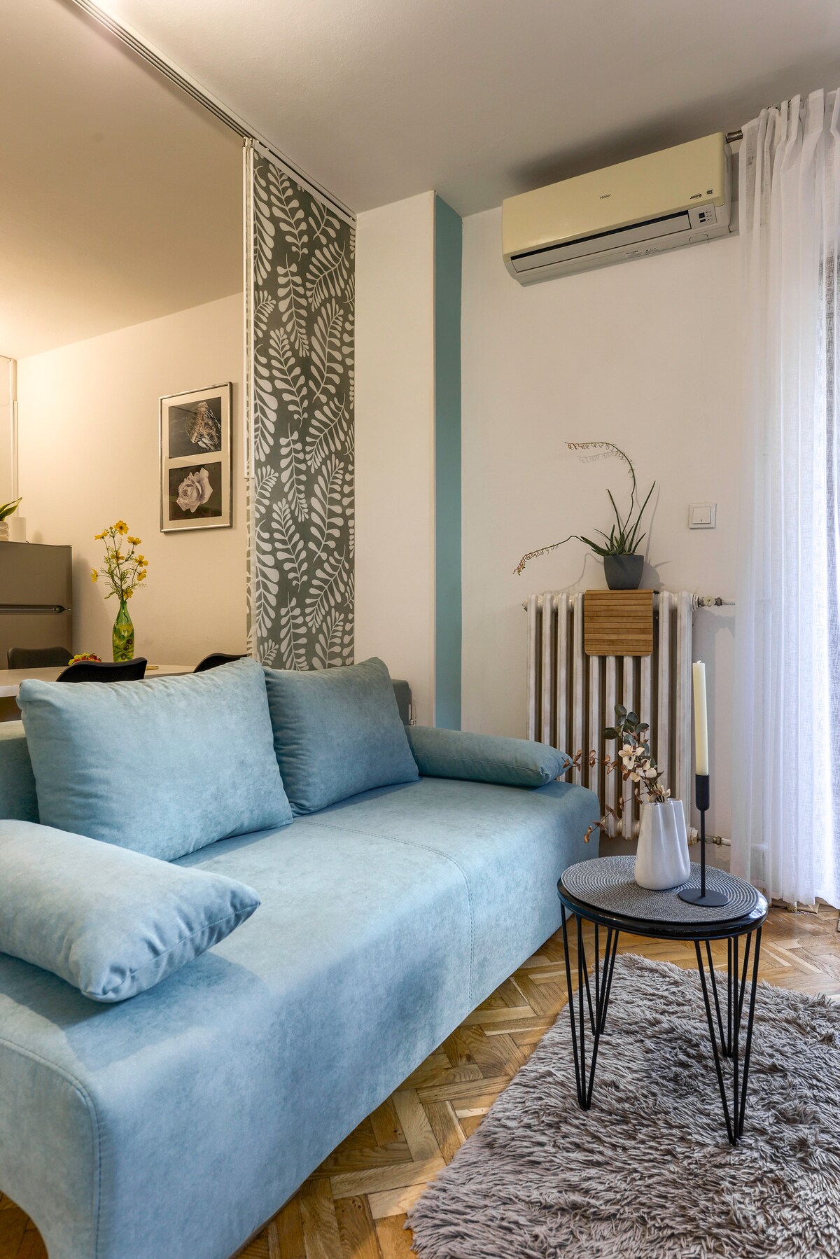 A lovely ground-floor apartment with a private, shady terrace, perfect for up to 4 guests. It features a cozy bedroom with a king-size bed. The bright living room also has a sofa bed for two. Enjoy a fully equipped kitchen, a modern bathroom with a shower, fresh sheets and towels. The spacious terrace is separated from other guests and offers a dining table and comfortable seating. Guests are welcome to use the barbecue in the backyard and enjoy meals in the garden under the fig tree.