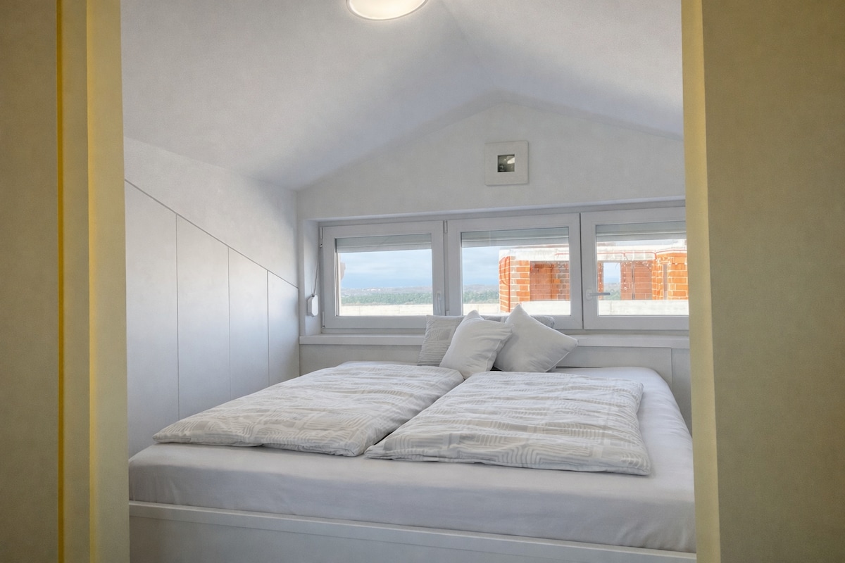 Novi apartman, moderno uređen. Sadrži sve potrebno za jednu obitelj (dvije spavače sobe, kupaonica, dnevni boravak, kuhinja, velika terasa na krovu sa pogledom na more). Na terasi se nalazi solarni tuš pergola sa stolom, stolicama i roštiljem. Apartman ima poseban ulaz i vlastito parkiralište. Nalazi se 700 metara od plaže, tržnice i trgovačkog centra. 800 metara od centra grada i niza restorana i ugostiteljskih objekata.