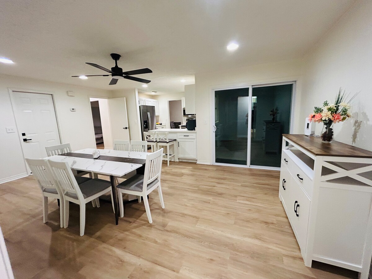 Come enjoy your morning coffee at this centrally located-fully renovated home. Close to Jacksonville & St Augustine. Gorgeous kitchen with brand new cabinets and quartz countertops. Fully fenced backyard. Dog friendly. Vinyl flooring throughout. Designated workspace by dining area. Coffee bar. This home is a 3-bedroom 2 bath. It has two queen beds and two twins in the bedrooms. There is also a pullout couch and a rollaway bed. It can sleep up to 9 guests. Long driveway for parking.