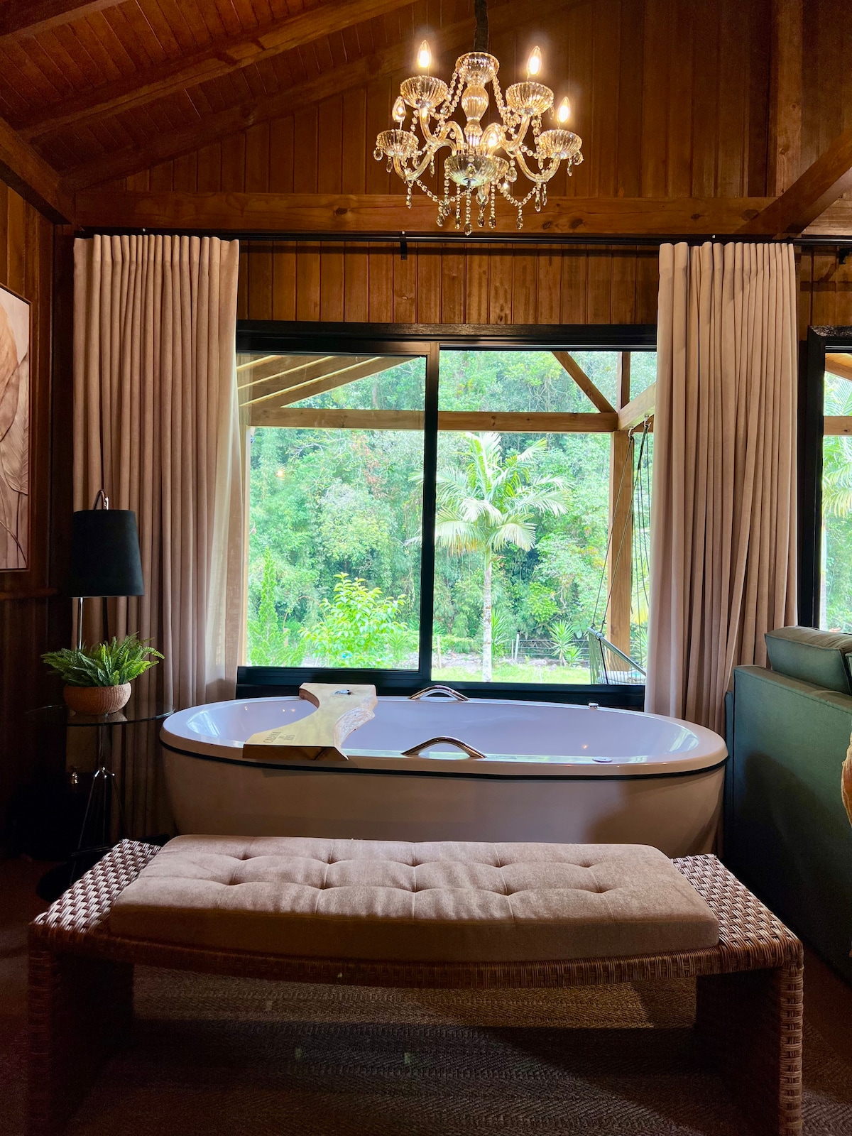 Κοντά στο SERRA DO RIO DO RASTRO. Το ξυλόσπιτο έχει "πράσινη" θέα προς όλες τις πλευρές. Η μπανιέρα βρίσκεται κάτω από τα δέντρα και είναι πλήρως ενσωματωμένη στη φύση, είναι σαν να βρίσκεστε στο δάσος, αλλά με την άνεση και την ασφάλεια του να είστε μέσα στο σπίτι. Ο χώρος είναι πολύ ήσυχος και απομονωμένος, εκτός από το κελάηδισμα των πουλιών. Τις βροχερές ημέρες η γυάλινη οροφή φέρνει πιο κοντά την επαφή και την αίσθηση της χαλάρωσης. Διαθέτει ζεστό νερό σε όλες τις βρύσες με θέρμανση αερίου.