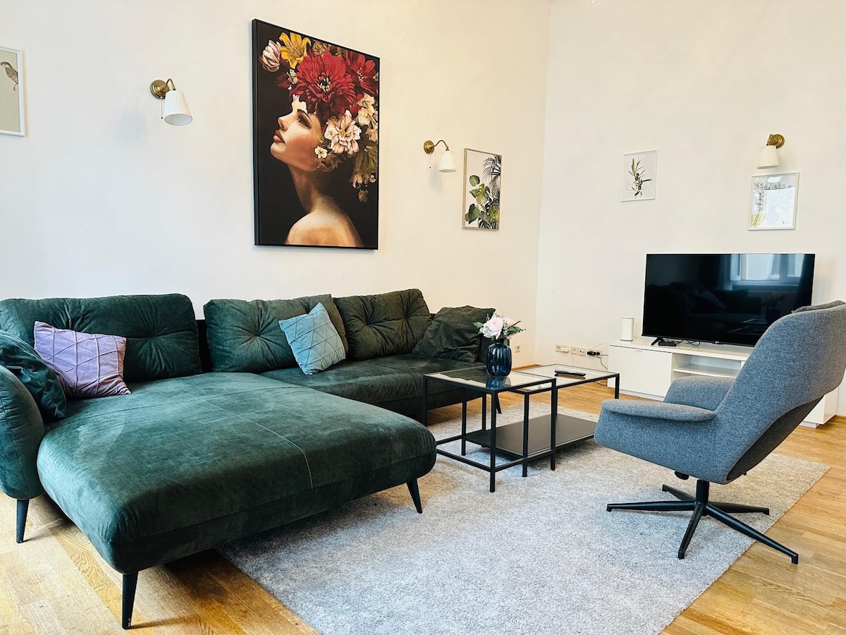 Die Wohnung hat 2 Schlafzimmer und ein großes Wohnzimmer mit einem großzügigen Esstisch, einem modernen Badezimmer mit Dusche und eine voll ausgestattete Küche mit separaten Essplatz. Die zentrale Lage ermöglicht es Ihnen, die ganze Stadt zu erkunden und bietet eine hervorragende Anbindung an öffentliche Verkehrsmittel und Sehenswürdigkeiten. In der direkten Umgebung finden Sie eine Vielzahl von Restaurants, Cafés, Einkaufsmöglichkeiten und kulturellen Attraktionen!
